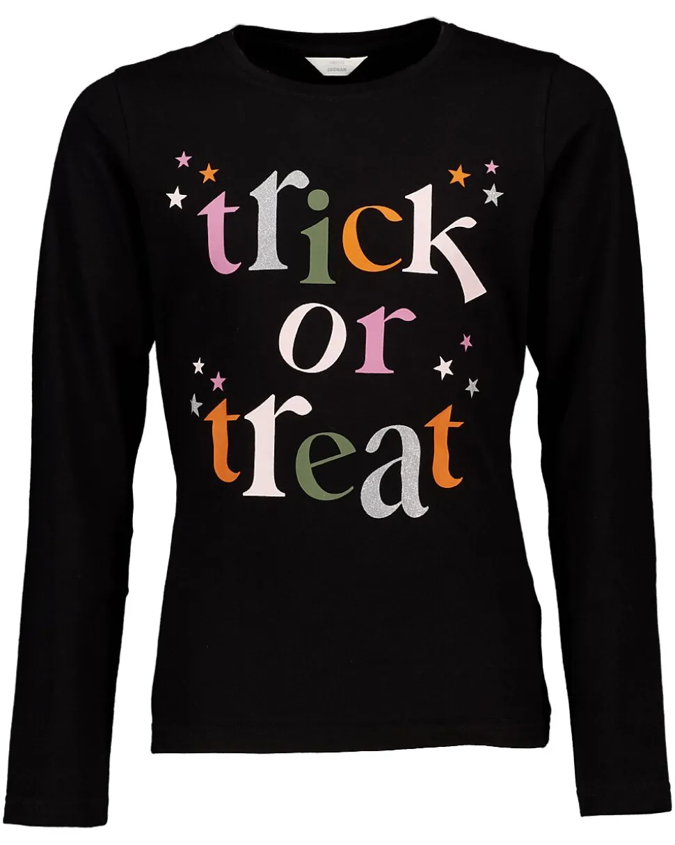 Ce t-shirt noir à manches longues pour enfants, unisexe, possède un col rond. Sur le devant, l’inscription ‘trick or treat’ est imprimée dans des couleurs vives, entourée de petites étoiles colorées. Le t-shirt est confectionné en jersey simple, une matière souple et douce. Parfait pour les enfants qui aiment les détails ludiques, par exemple lors d’une fête à thème ou pour Halloween.