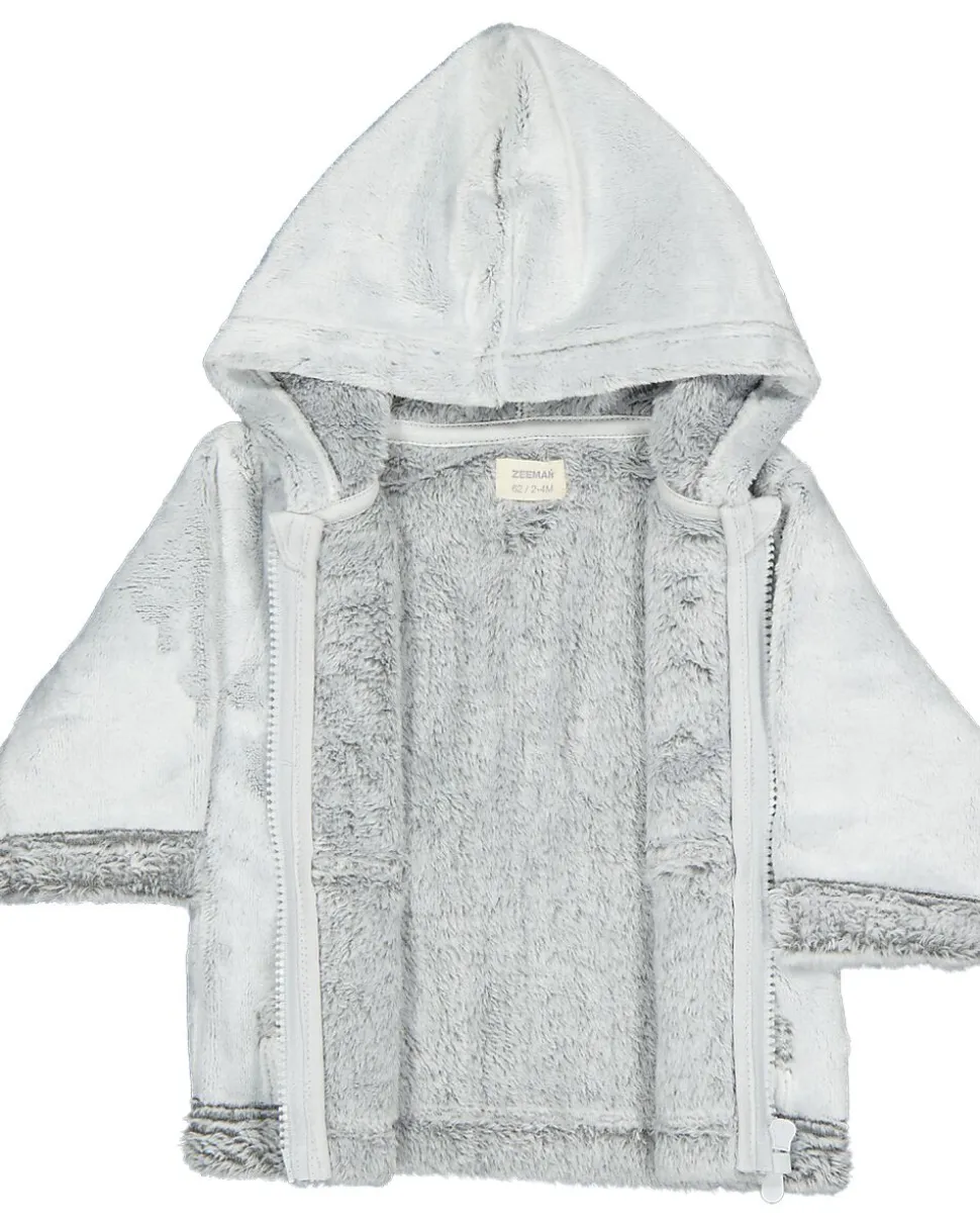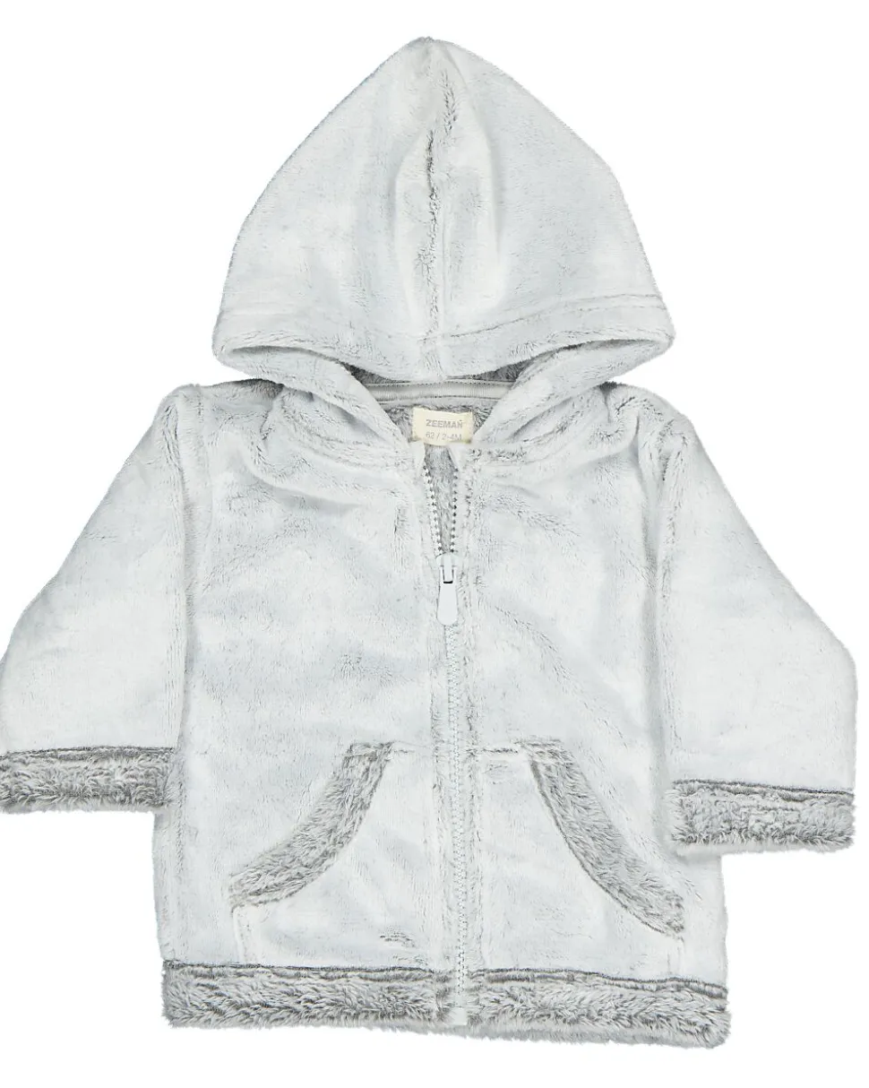 Cette veste grise pour bébé a un aspect doux et est fabriquée en coral fleece. La veste a une capuche, des manches longues et une fermeture éclair sur le devant, ce qui permet de l’enfiler et de l’enlever facilement. Les poches plaquées sur le devant sont pratiques pour emporter de petits objets ou garder les mains au chaud lors des journées fraîches.